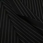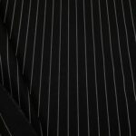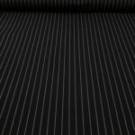 Mittelschweres, schwarzes Baumwoll Leinen und Cupro Gemisch mit klassischem Nadelstreifenmuster. Die weissen, garngefärbten Streifen sind knapp 1 mm breit und verlaufen längs, perfekt für elegante Hosen oder sogar einen Anzug.
