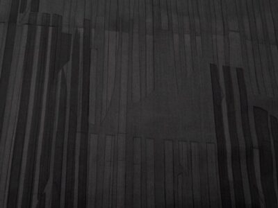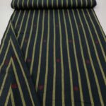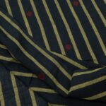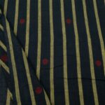 Eine grauschwarze Baumwolle, durchzogen von grünlich-gelben Streifen und akzentuiert mit einem feinen, roten Jamdani-Punkt – ein subtiler Blickfang auf zartem Gewebe. Jamdani ist eine traditionsreiche Webtechnik aus Indien, bei der feiner Musselin mit kleinen, geometrischen Motiven von Hand durchwirkt wird – eine Kunstform, die seit Jahrhunderten gepflegt wird.