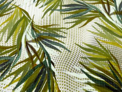 Dünne, eher feste, weisse Baumwollpopeline mit papierigem Griff. Bedruckt mit einem grossflächigen Pflanzenmuster in einem wunderbaren Grün, wirkt der Stoff frisch und sommerlich.