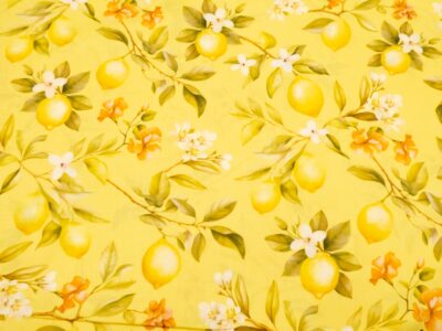 Hochwertiger, elastischer und dünner, pastellgelber Baumwolljersey mit roten Kirschen (7cm hoch) von Hilco. Durch den 5% Elasthananteil ist der Stoff besonders formstabil und beult auch bei häufigem Tragen nicht aus.