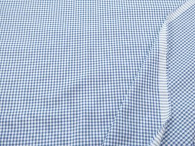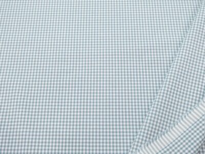 Dünne, eher feste Baumwollpopeline mit papierigem Griff. Bedruckt mit einem kleinkarierten, hellblauen Vichymuster und grossen sowie kleinen Margariten, das weckt sofort Träume von einem heissen Sommertag.