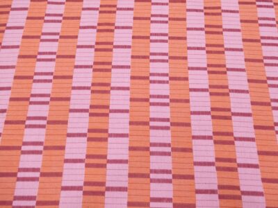 Weicher und dünner, minikarierter Baumwollstoff, garngefärbt in Rot und Rosa. Er fühlt sich ähnlich wie ein leichter Seersucker an, ist jedoch keiner. Die Oberfläche ist leicht körnig im Griff und wirkt dadurch lebendig und natürlich.