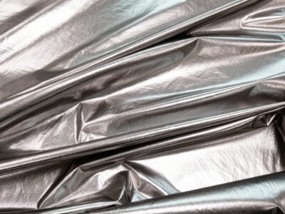 Aussen zeigt der dünne und elastische Stoff eine glatte, leicht silberglänzende Oberfläche, die optisch an Kunstleder erinnert, jedoch deutlich weicher und dehnbar ist. Innen befindet sich ein weisser, angenehm glatter Trägerstoff, auf den die silberne Beschichtung auflaminiert wurde.