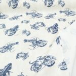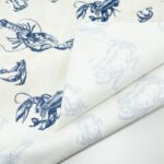 Shellfish zeigt ein liebevoll von Hand gezeichnetes Krebstier-Design (16cm lange, dunkelblaue Krebse) mit feinen Linien und einem tintenartigen Look, der dem Motiv besondere Tiefe verleiht. Der strukturierte, beigeweisse Hintergrund erinnert an Sandstein und lässt das Muster wirken wie ein Blick auf den Meeresboden. Mit einer schützenden PVC-Beschichtung ist dieser Stoff ideal für Taschen, Tischdecken oder andere robuste Projekte.