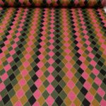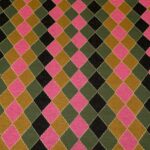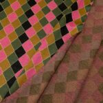 Dünner, leicht elastischer Jacquard-Strick mit edlem Harlekin-Muster in Rosa, Grün und Senfbraun, durchzogen von zartem Goldfaden. Ein eleganter Stoff für besondere Anlässe, der auch im Alltag einen Hauch von Glanz verleiht.