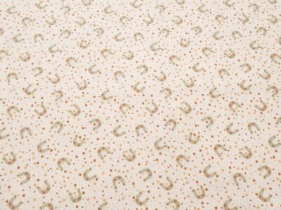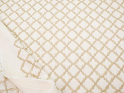 Dieser Stoff besteht aus dünner, aber fester Baumwolle in Naturfarbe und ist mit einem hellbeigegrauen Wellenmuster bedruckt. Die Wellen sind ca. 12 mm hoch und verleihen dem Stoff eine ruhige, aber kunstvolle Optik.