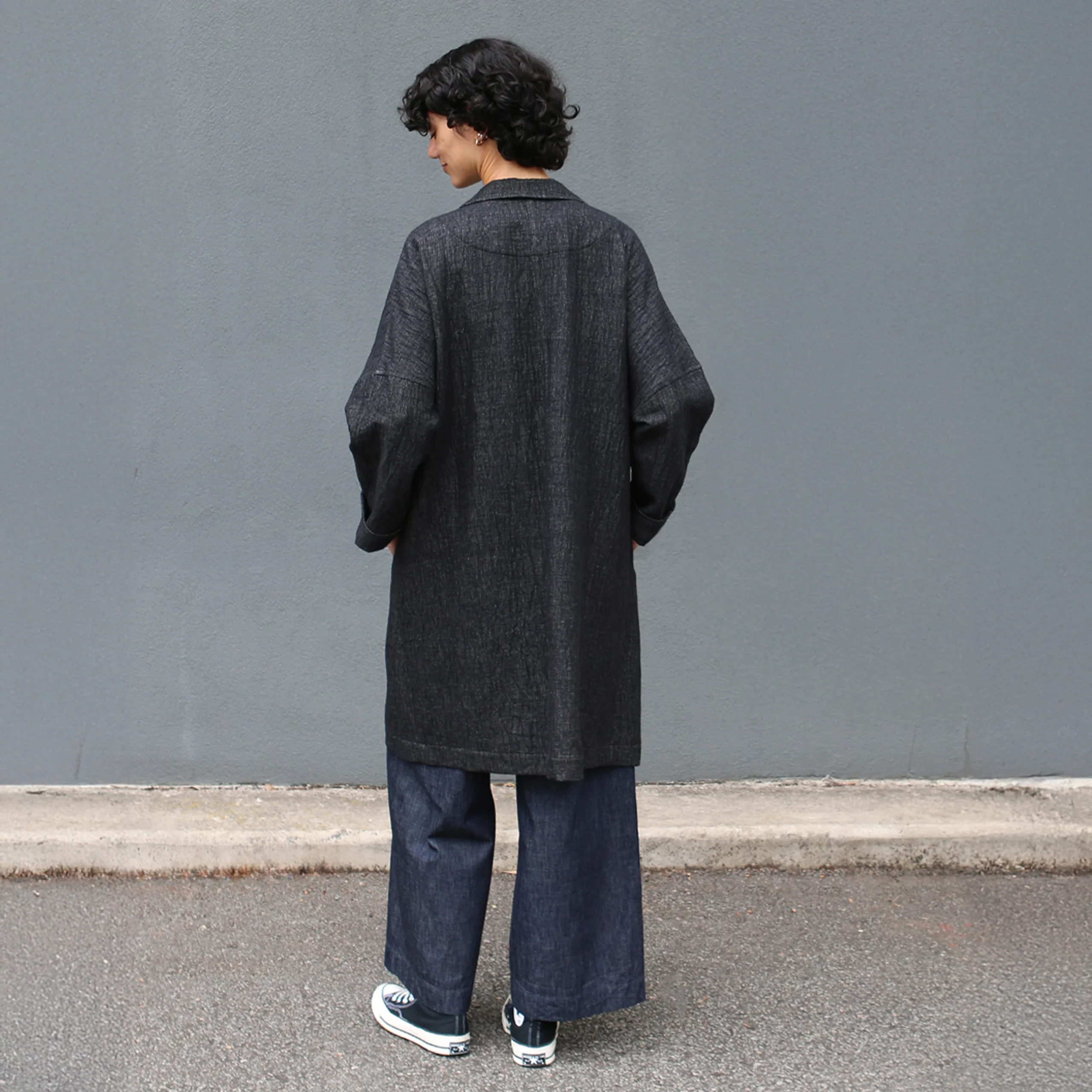 Die kragenlose Form, überschnittenen Schultern und weite Ärmel machen ihn zu einem idealen Layering-Piece, das mühelos über Strick oder leichte Jacken passt. Der markante, asymmetrische Saumverlauf, hinten länger, vorn leicht abgerundet, sorgt für einen modernen, architektonischen Look.