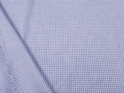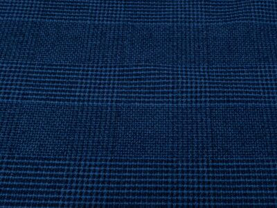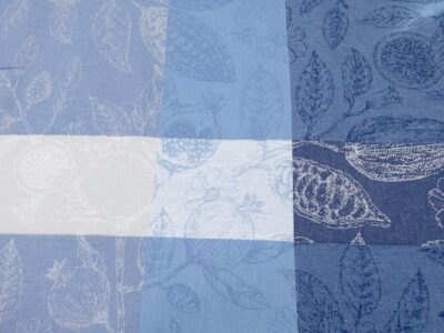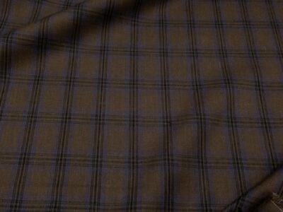 Farbenfrohe (blau, braun, natur und hellorangebraun), dünne (135gr/m2) und etwas grob gewobene, weiche, garngefärbte Baumwolle von Fabelism. Musterwiederholung waagrecht: 14.8 cm senkrecht: 15.8 cm