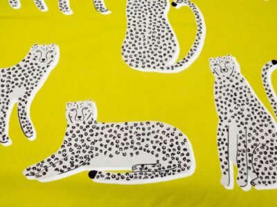 Dünner (180gr/m2), elastischer Baumwolljersey bedruckt mit orangenen, braunen und gelben Tiger