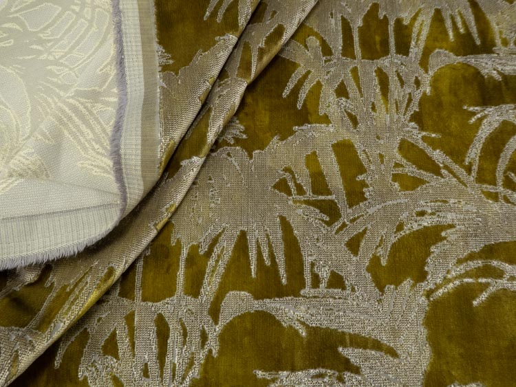 Robuster, schwerer (571gr/m2) dunkelgiftgelber Brokatstoff mit Palmenblätterdesign, ideal für Kissen.