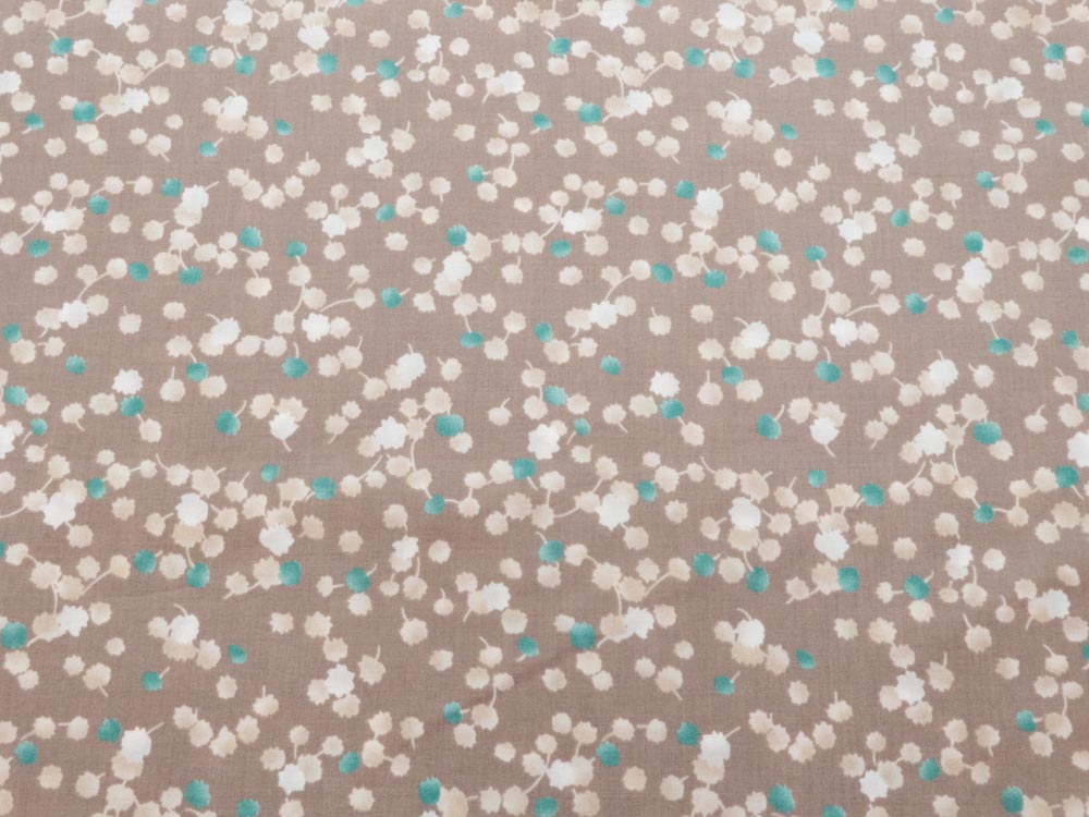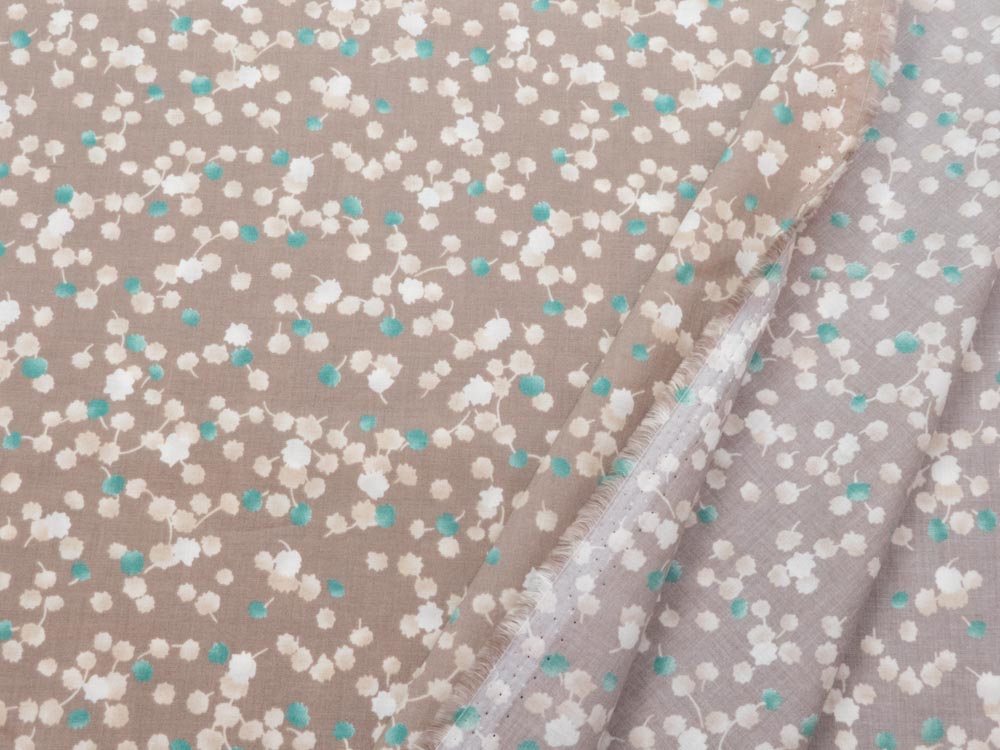 Dünne, sehr weiche seidenähnliche Bio-Baumwolle (Cotton Lawn) in graubeige, mit türkisfarbenen und hellbeigen kleinen Blüten, iodela für ein Sommerkleid