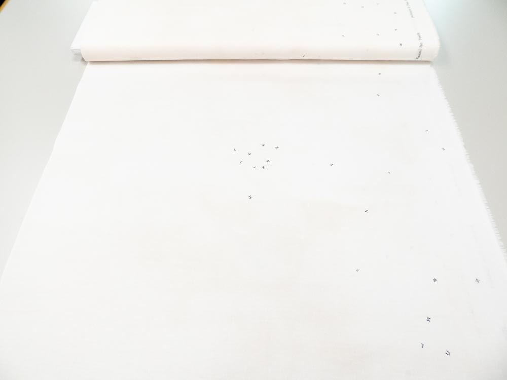 Dünnes, weiches, alabasterweisses Baumwoll- und Seidengemisch (Twill) mit schwarzen Buchstaben seitlich entlang der Webkanten, von Nani Iro.