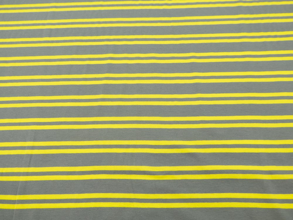 Elastischer, grauer Baumwolljersey mit 6mm breiten, neongelben Querstreifen