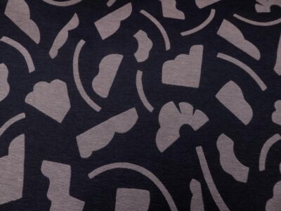 Grob gewobenes Baumwoll- und Leinengemisch, bedruckt mit hellgrau als Hintergrund und hellbeigenen Fester (ca 5x7cm)