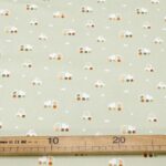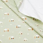 Dünner, weicher, pistachegrüner Feincord mit Autos und Lastwagen