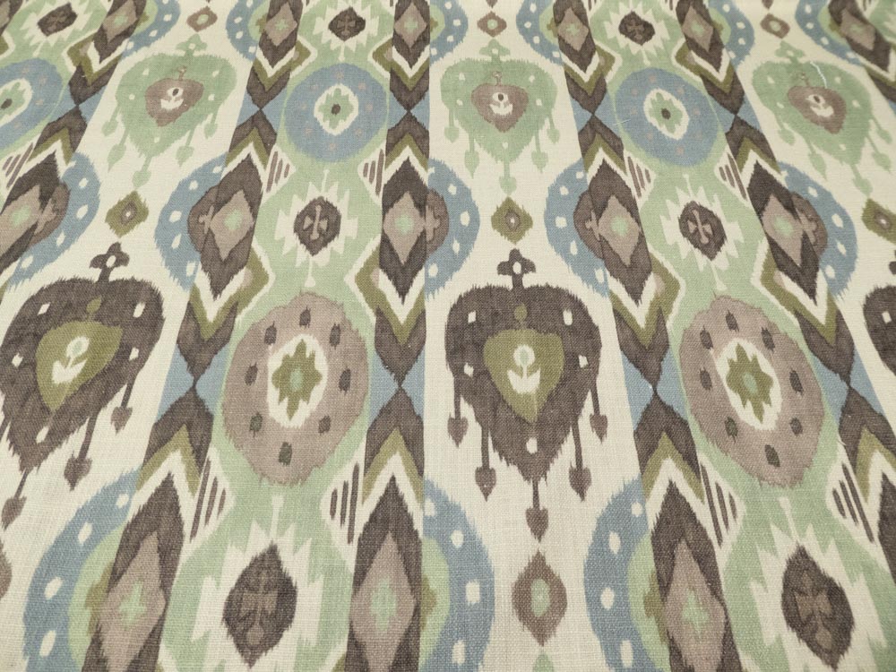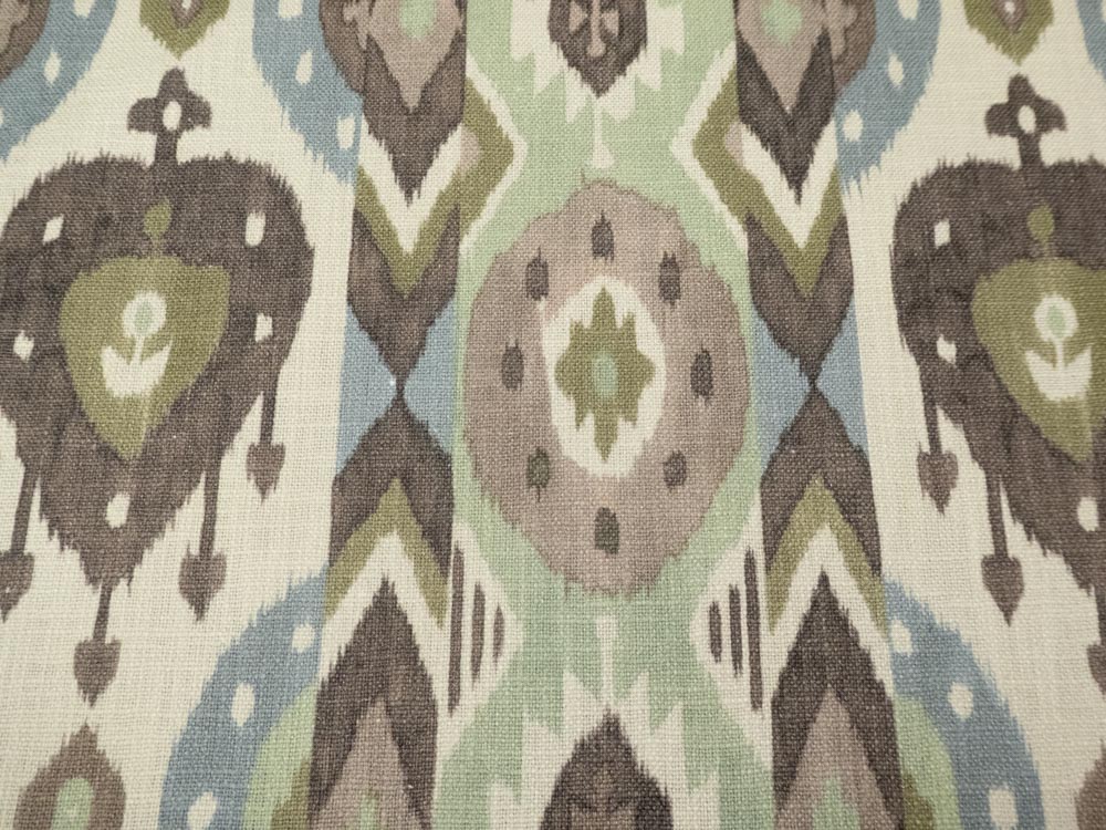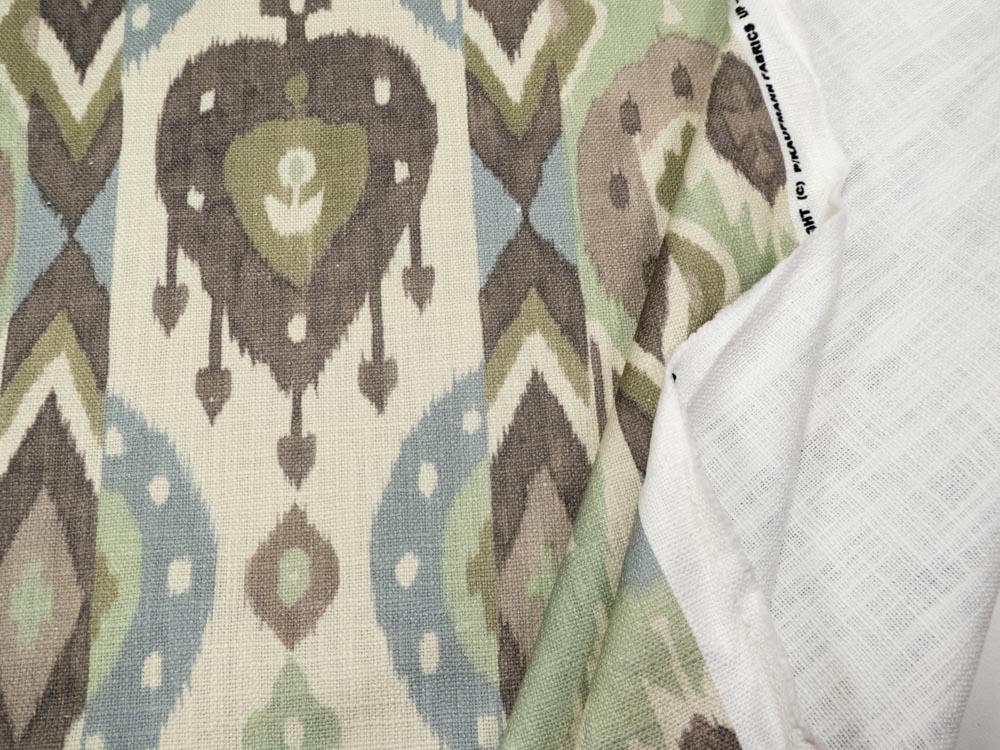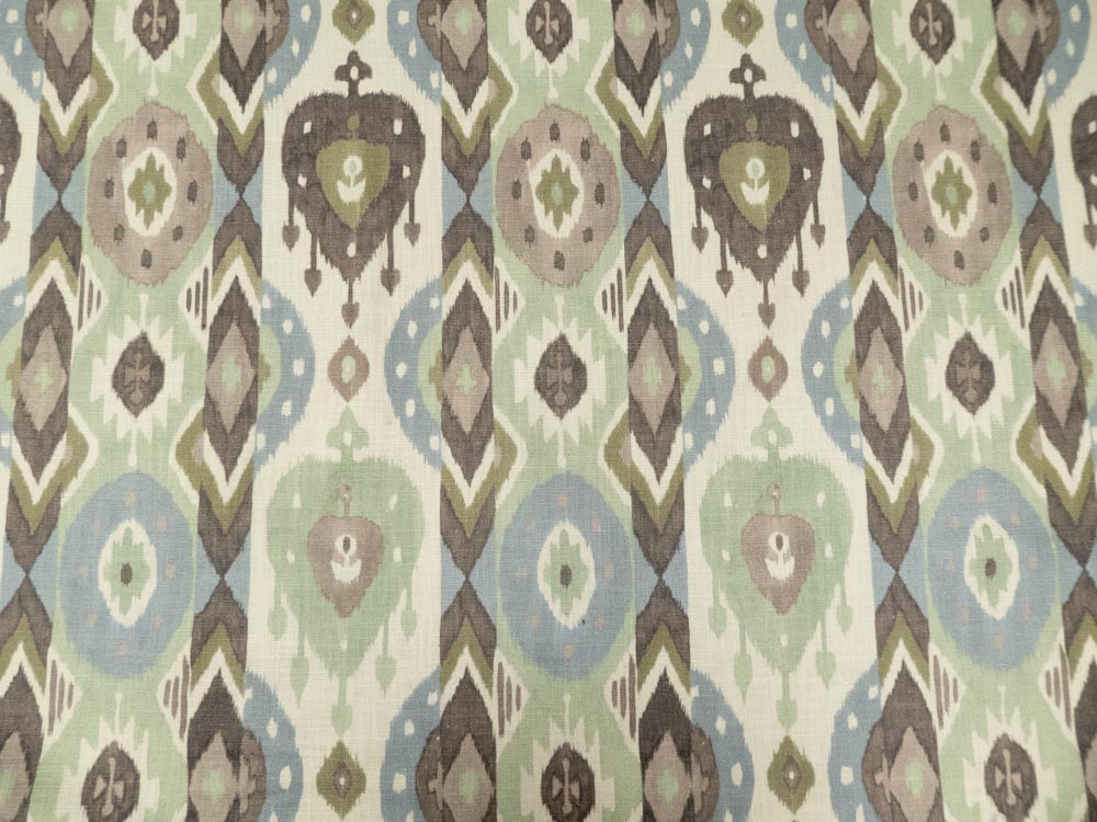 Festes, mittelschweres (184gr/m2), grob gewobenes, weisses Baumwoll- und Leinengewebe, bedruckt mit einem Ikatmuster in hellblau und grün, grau, hellbeige und schlammbraungrau
