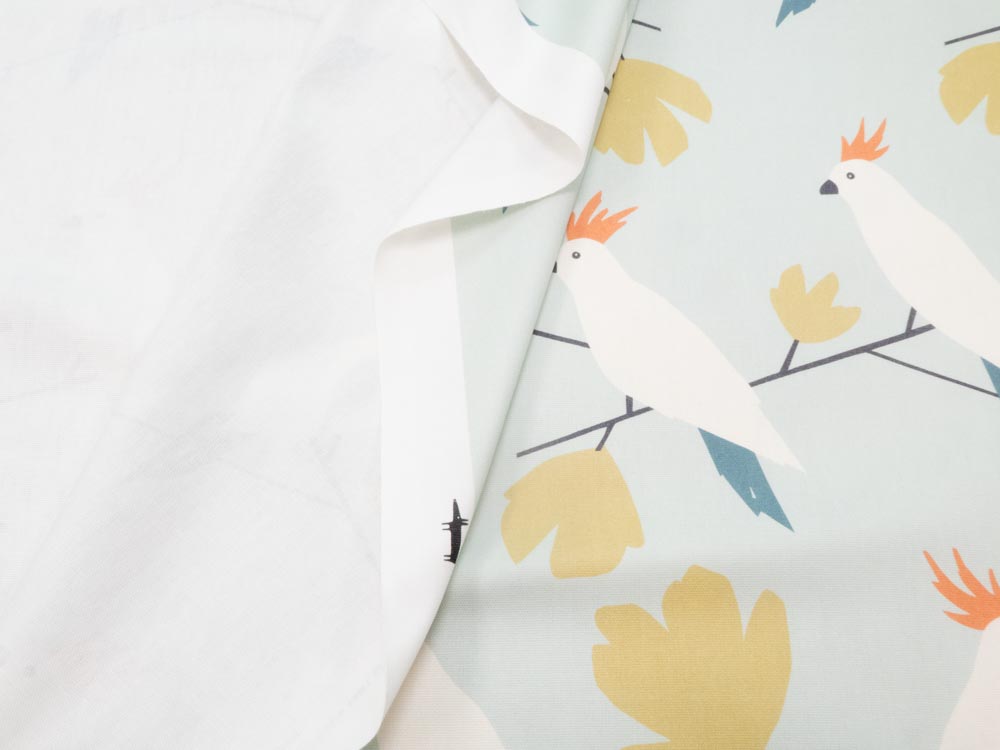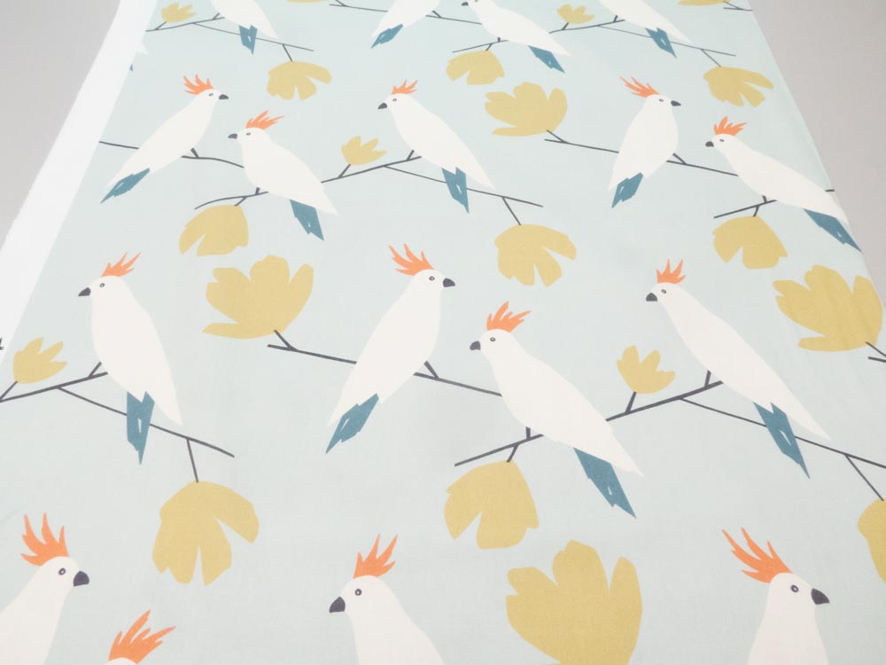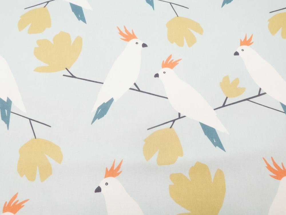 Übergrosse Papageien (20cm) im Dschungel auf einem mintgrünem, weichem Baumwollcanvas