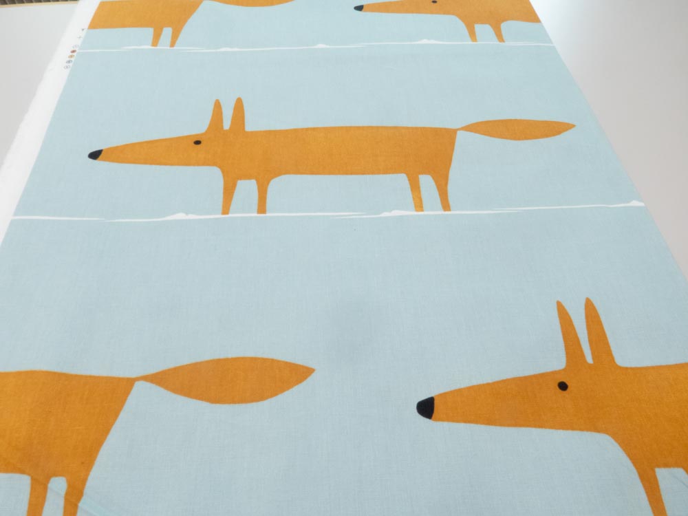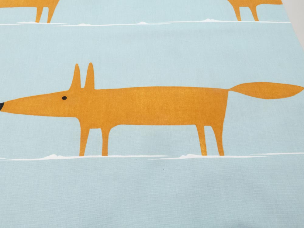Weicher, robuster, hellblauer Baumwollcanvas (220gr/m2) mit okerfarbenem XXL Fuchs-Print (61cm lang).Idealer Dekorationsstoff (Martindale-Test 20000 Reiben ohne Fadenbrüche)
