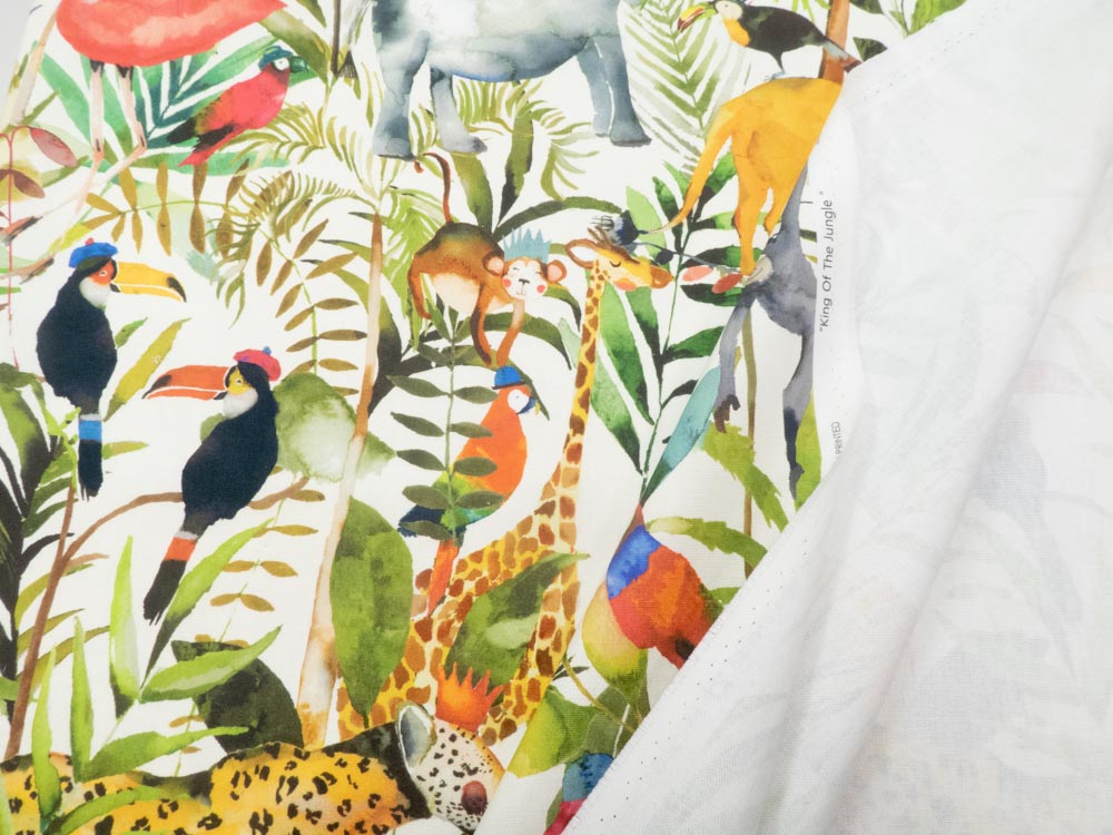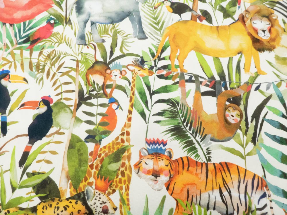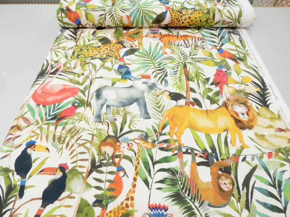 Fester, dicker, eierschalenweisser Baumwollcanvas mit wunderbarem Dschungelmuster, ideal für Vorhänge