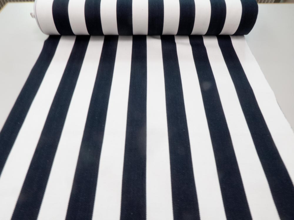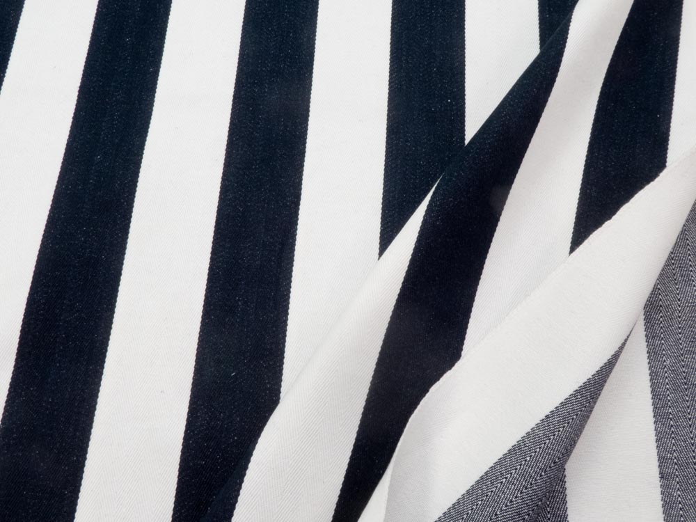 Robustes, dickes (305gr/m2), weiches, weisses Bauwollwollgewebe (305 gr/m2) in Fischgratbindung mit breiten (5cm), schwarzen Längsstreifen, idealer Dekostoff, da hohe Scheuerbeständigkeit (30’000)