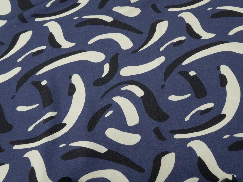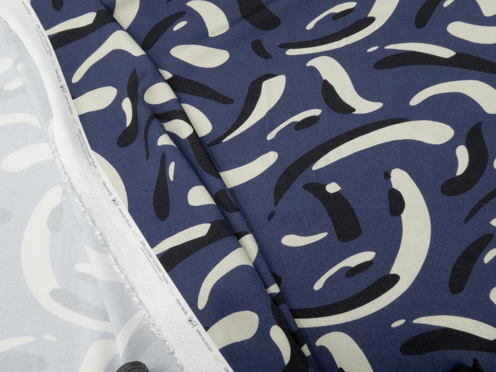 Schön fallender, leichter (150gr/m2) und superweicher, dunkelblauer Viskose Twill mit tanzenden Tropfen in schwarz und hellgrau, gewoben aus 100% LENZING ECOVERO Fasern. LENZING ECOVERO wird aus zertifizierten erneuerbaren Holzquellen in einem umweltbewussten Produktionsprozess gewonnen, der hohe Umweltstandards erfüllt. LENZING ECOVERO-Fasern sind mit dem EU Ecolabel zertifiziert.