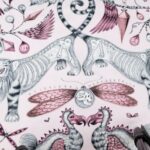 Fester, schwerer, hellrosafarbner Baumwollsatin (220gr/m2) mit rosa und schwarzweissen, übergrossen gezeichneten Tieren aus der Kollektion von Animalia von Emma J. Shipley. Das Muster wiederholt sich alle 56.8cm, ideal für Kissenbezüge