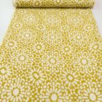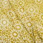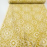 Ein markanter Bagru-Blockprint in einem leicht verwaschenen Olivenölgelb und einem warmen Steinton. Bagru, ein kleines Dorf in Rajasthan, etwa 35 Kilometer von Jaipur entfernt, ist bekannt für seine traditionelle Hand-Blockdruckkunst mit natürlichen Farben und klassischen Techniken. Im Vergleich zu den farbenfrohen und detailreichen Sanganer-Prints sind Bagru-Drucke meist schlichter und auf wenige Farben reduziert.