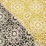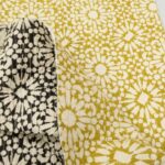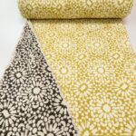 Ein markanter Bagru-Blockprint mit schwarzer Vorderseite und Olivenölgelber Rückseite. Bagru, ein kleines Dorf in Rajasthan, etwa 35 Kilometer von Jaipur entfernt, ist bekannt für seine traditionelle Hand-Blockdruckkunst mit natürlichen Farben und klassischen Techniken. Im Vergleich zu den farbenfrohen und detailreichen Sanganer-Prints sind Bagru-Drucke meist schlichter und auf wenige Farben reduziert.