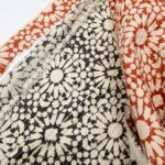 Diese Blockprints sind im Abstand von 1 Zentimeter mit geraden Linien abgesteppt. Zu beachten: Die horizontalen Stepplinien, wie auf dem Detailbild zu sehen, verlaufen etwa alle Meter. Diese Linien sind fester Bestandteil des Stoffes und erscheinen auch bei kleineren Zuschnitten, zum Beispiel bei einem Meter.