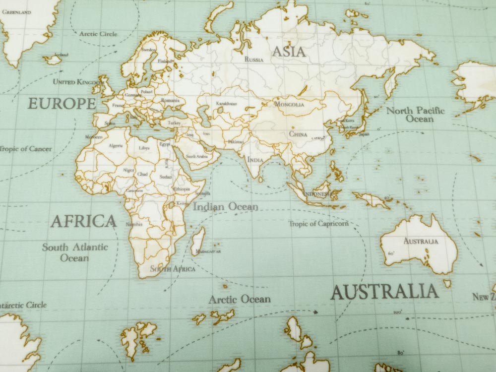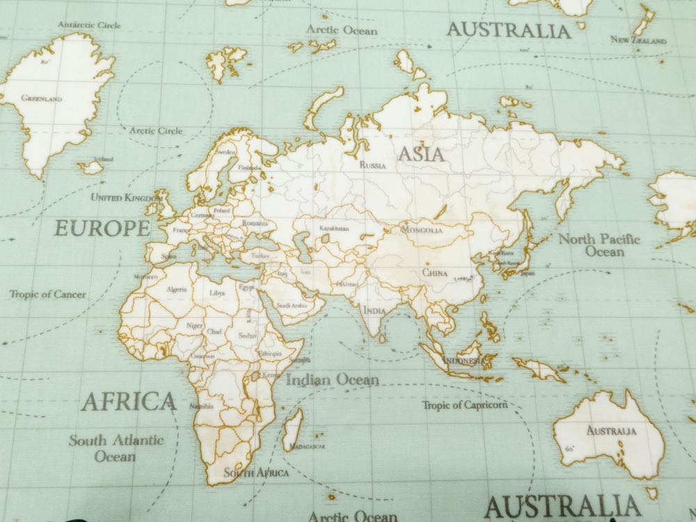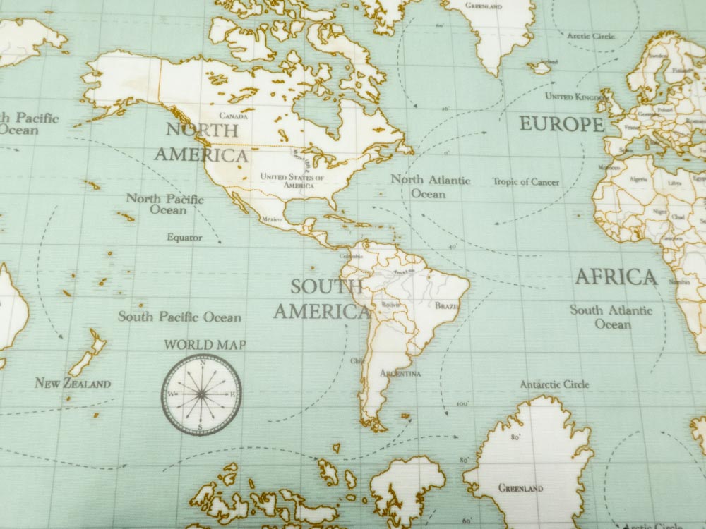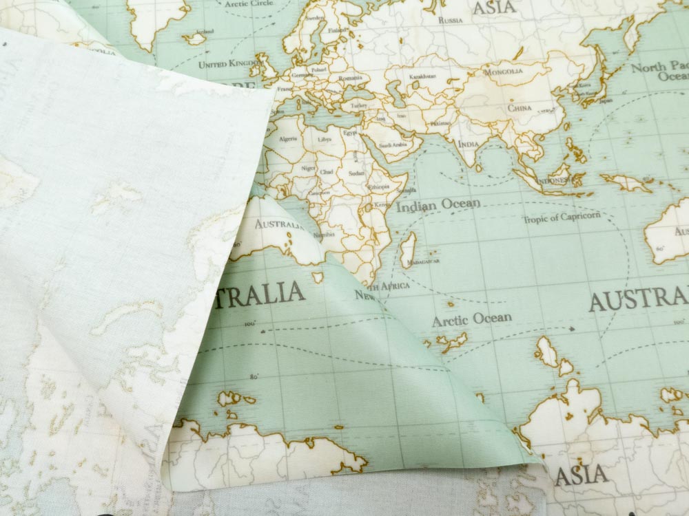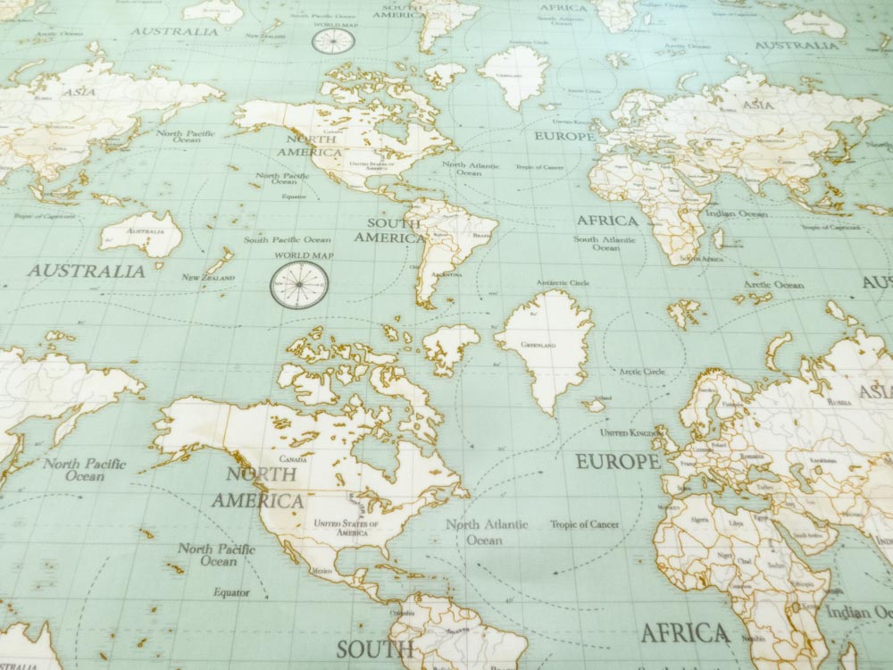 Salbeigrüner, matt beschichter, fester Baumwollcanvas bedruckt mit Weltkarte, ideal für Tischtücher