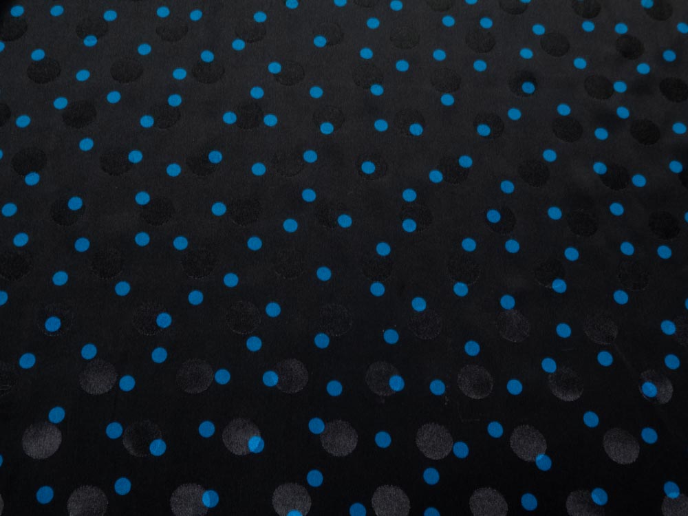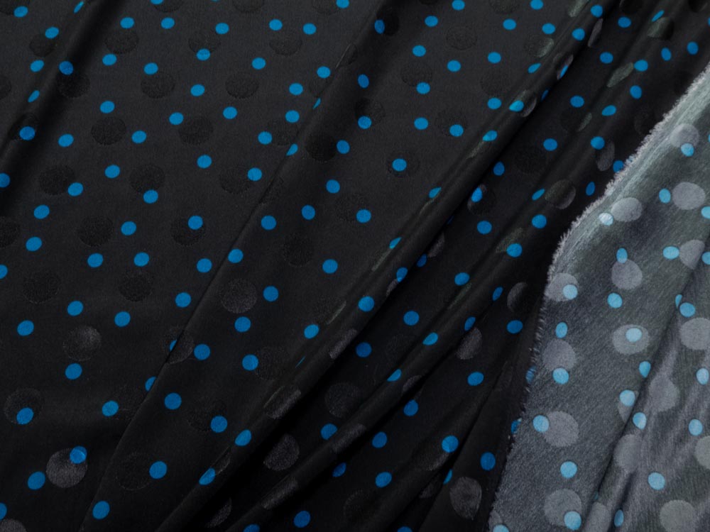 Etwas schwerer (110gr/m2), schwarzer Satin Jacquard mit schwarz glänzenden (1.8cm) und türkisblauen (0.8cm) Punkten