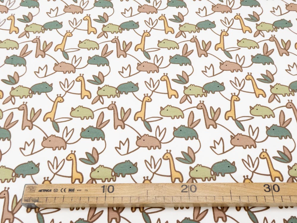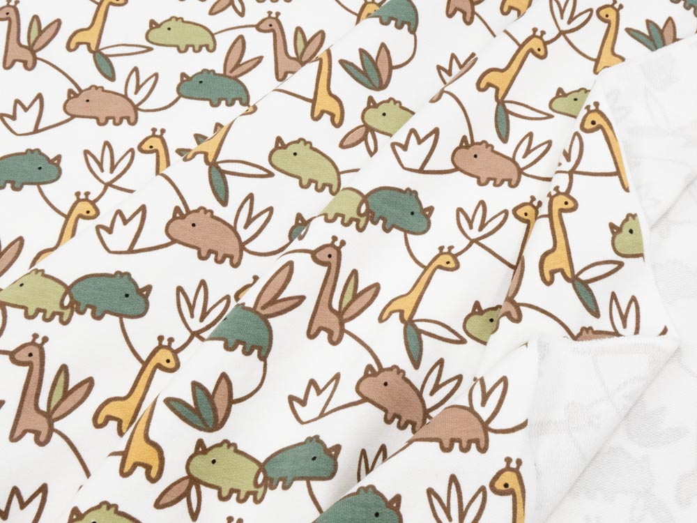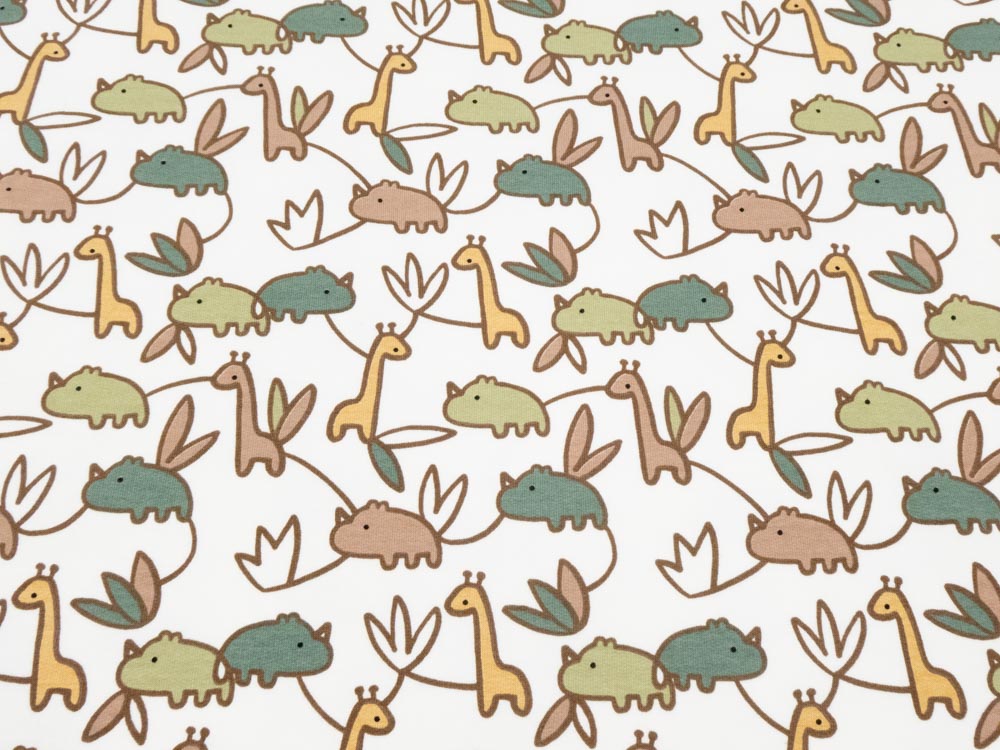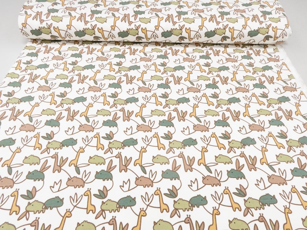 Dünner (221gr/m2), weicher, sehr süsser, weisser, elastischer Sweat mit Giraffen und Nashörner, innen leicht aufgerauht, ideal für Pullover oder warme Kinderhosen