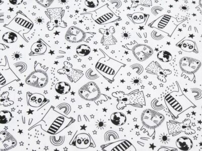 Dünner (221gr/m2), weicher, elastischer und weisser Sweat mit blauen Punkten (5mm) und Pfeilen (3cm), innen leicht aufgerauht, ideal für Pullover oder warme Kinderhosen. Dieser Sweat passt zum Sweat Gevater Dachs (Art. H-A-4571-1)