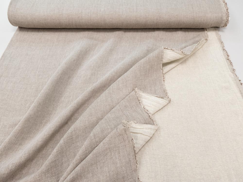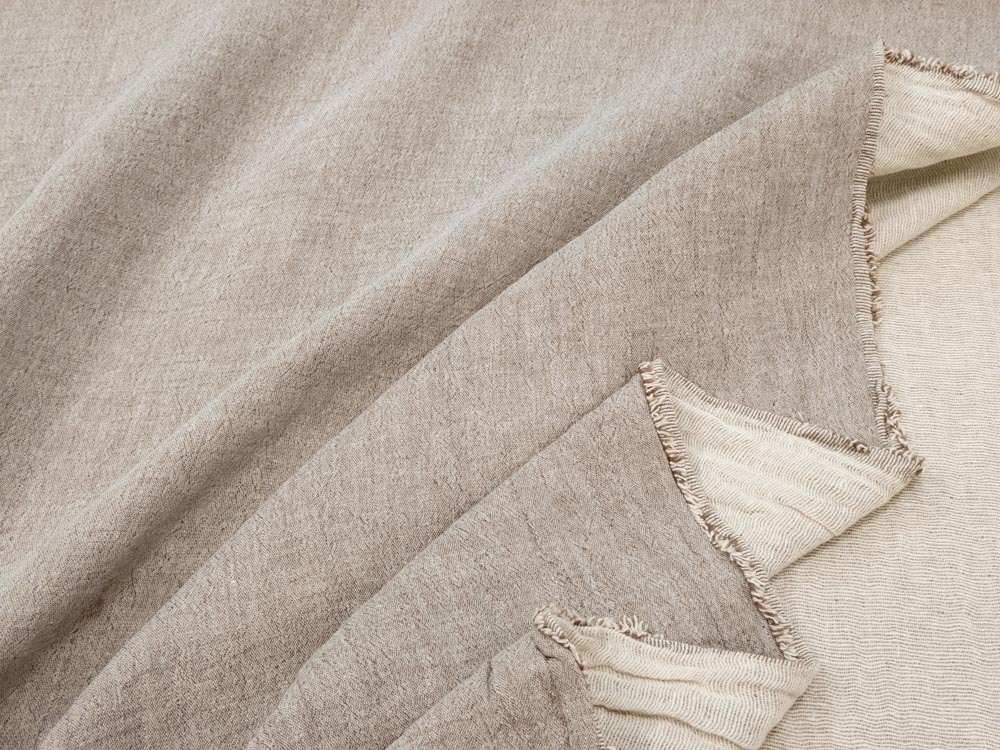 Sehr weiche und dünne (205gr/m2) Double Gauze, eine Seite aus grob gewobener, naturfarbene Gaze, die andere aus einer feinen, beige-melierten Musselin
