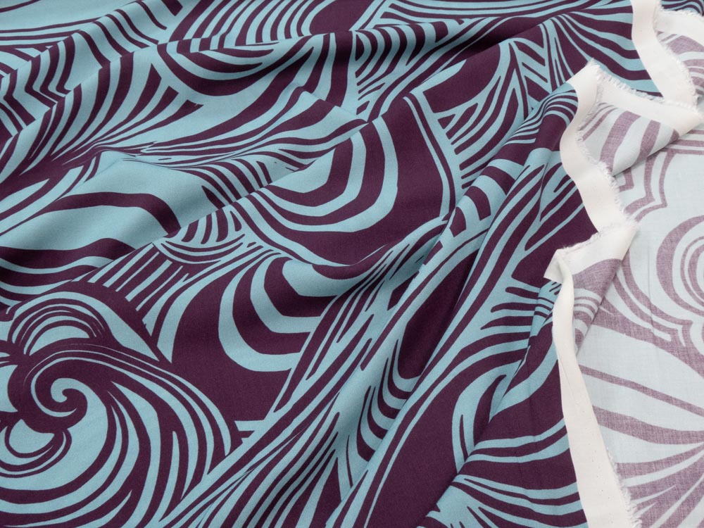 Stoff Viskose türkis mit bordeaurotem Wellenmuster