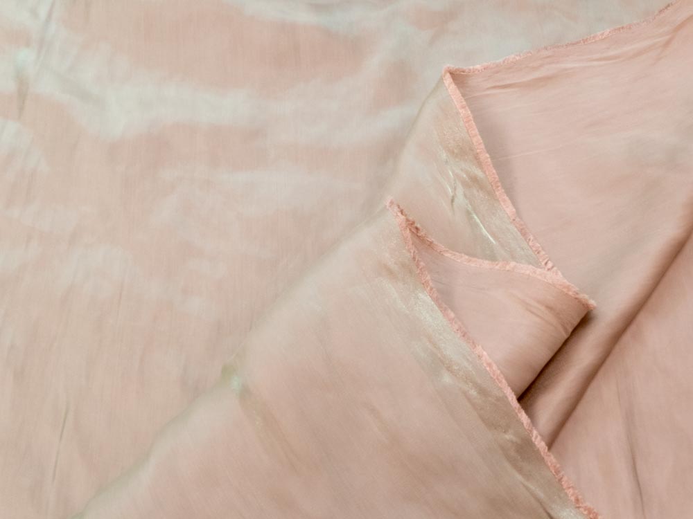 Weichfallendes Gewebe aus Mikrofaser, die rechte Seite mit einem schimmernden Glanz zwischen beige, rosa und grün, je nach Licht, die linke ist matt altrosa