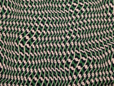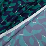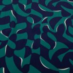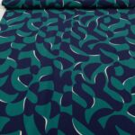 Dünner, weichfallender Viskosekrepp mit dunkelblauen geometrischen Formen auf grünblauem Hintergrund. Der Stoff eignet sich besonders für einfach geschnittene Blusen und Oberteile mit fliessender Silhouette.