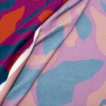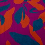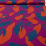 Feiner, weich fallender Viskosekrepp in leuchtendem Fuchsia, bedruckt mit grossen abstrakten Blättern in Orange und Petrolblau. Die kräftigen Farben bringen Frische in die Wintergarderobe, der ideale Stoff für eine auffällige Bluse an grauen Tagen.
