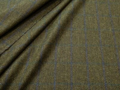 Mittelschweres olivgrünes Tweed Wollgewebe mit Fischgratmuster und zusätzlichem Karomuster in Rot und Orangetönen. Das Gewebe ist auf der linken Seite beschichtet, wodurch der Stoff windabweisend und wasserabweisend ist, mehr Stand erhält und sich ideal für Jacken und Sakkos eignet. Ein sehr schönes, hochwertiges Gewebe mit klassischem Charakter. Der Stoff überzeugt durch seinen authentischen, leicht griffigen Wollgriff und erinnert an einen Harris Tweed.